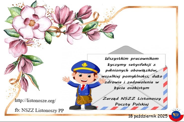 KOMUNIKAT - Pismo WRZ, info z dnia 16.11.2023 r.[całość pisma] KOMUNIKAT - Pismo z Sejmu, info z dnia 16.11.2023 r.[całość pisma] KOMUNIKAT - Pismo WRZ, info z dnia 27.10.2023 r.[całość pisma] KOMUNIKAT - Okulary, info z dnia 24.10.2023 r.[całość pisma] KOMUNIKAT - Życzenia z okazji dnia łącznościowca, info z dnia 18.10.2023 r. Drodzy Pocztowcy Z okazji naszego pocztowego święta pragniemy przekazać wszystkim pracownikom, wyrazy szacunku i serdeczne podziękowanie za trud codziennej pracy. Dziękując za Waszą pracę życzymy wytrwałości w tej niezmiernie ważnej i odpowiedzialnej służbie, powodzenia w realizacji nowych, ambitnych zamierzeń, -wszelkiej pomyślności w życiu osobistym i rodzinnym. Ze związkowym pozdrowieniem Piotr Saugut Przewodniczący Niezależnego Samorządnego Związku Zawodowego Listonoszy Poczty Polskiej [całość pisma] KOMUNIKAT - Ze strony Sejmu, info z dnia 10.10.2023 r.[całość pisma] KOMUNIKAT - Okulary, info z dnia 10.10.2023 r.[całość pisma] KOMUNIKAT - Pismo do Pani Marszałek Sejmu, info z dnia 06.10.2023 r.[całość pisma] KOMUNIKAT - Pismo, info z dnia 04.10.2023 r.[całość pisma] KOMUNIKAT - info z dnia 15.09.2023 r.[całość pisma] KOMUNIKAT - Pismo do Zarządu PP w sprawie wzrostu wynagrodzeń, info z dnia 14.08.2023 r.[całość pisma] KOMUNIKAT - Petycja złożona przez NSZZ Listonoszy Poczty Polskiej odnośnie przywrócenia możliwości przechodzenia na wcześniejszą emeryturę przez Listonoszy została umieszczona na stronie Sejmu RP Ze związkowym pozdrowieniem Piotr Saugut Przewodniczący NSZZ Listonoszy Poczty Polskiej, info z dnia 02.08.2023 r.[całość pisma] KOMUNIKAT - Odpowiedź MAP na pismo WRZ, info z dnia 01.08.2023 r.[całość pisma] KOMUNIKAT - Pismo CKS, info z dnia 20.06.2023 r.[całość pisma]